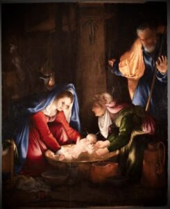 Non giร lโAdorazione dei Magi, ma un episodio di intimitร domestica attinto al Protoevangelio di Giacomo. Al centro, la Vergine immerge il Neonato in una conca dโacqua: gesto materno che si fa sacramento di purificazione. Accanto a Lei, lโanziana levatrice Salomรจ โ talora detta Anastasia nel Vangelo dellโInfanzia โ con lo sguardo rapito dal prodigio: la tradizione narra che, incredula alla verginitร di Maria, vide le sue dita contratte guarire al tocco della divina tenerezza. Giuseppe, emblema dellโuomo comune, umilmente partecipe del mistero.