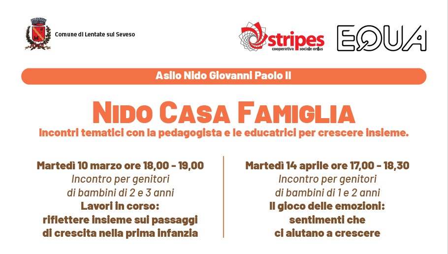 Il Comune ha approvato gli incontri tematici con la pedagogista e le educatrici per crescere insieme con la collaborazione della cooperativa Stripes Equa.