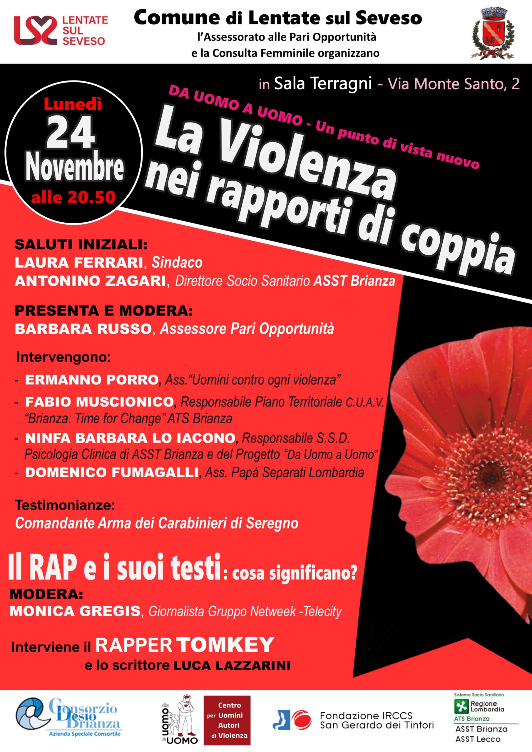 L’Assessorato alle Pari Opportunità e la Consulta Femminile organizzano in Sala Terragni di via Monte Santo n. 2 (di fianco alla Biblioteca comunale) un convegno sulla “Violenza nei rapporti di coppia” Da Uomo a Uono – un punto di vista nuovo.