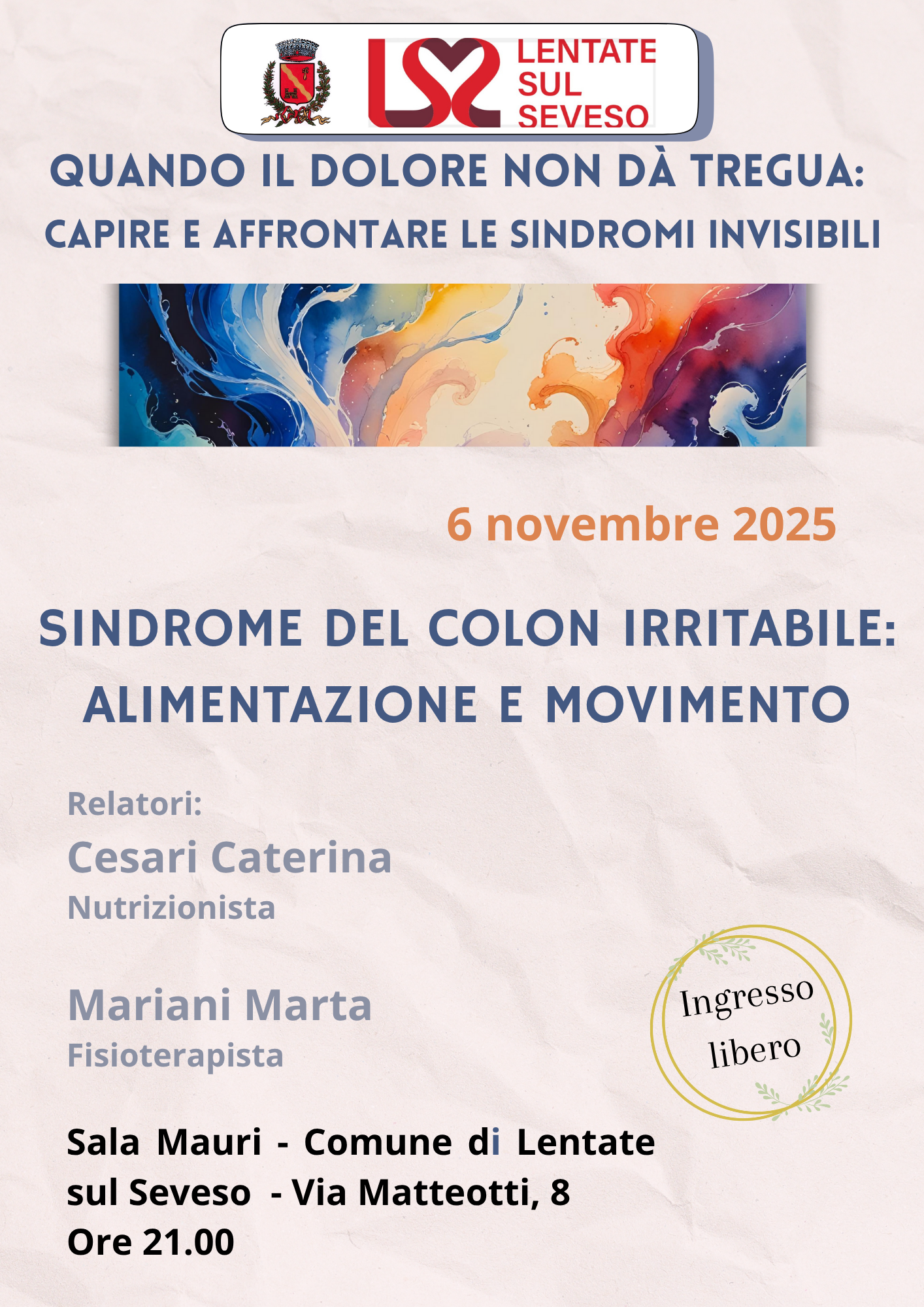 Il tema della serata è “Quando il Dolore non da’ tregua: Capire e Affrontare le sindromi invisibili”