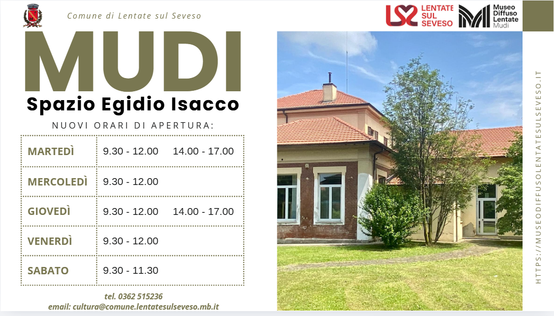 L’Assessorato alla Cultura del Comune di Lentate sul Seveso comunica con piacere che, a partire da martedì 17 febbraio 2026, il MuDi – Museo Diffuso di Lentate sul Seveso, in particolare lo Spazio Egidio Isacco di Via Aureggi, implementa e amplia i propri orari di apertura al pubblico per rendere più accessibile la collezione civica naturalistica e le iniziative culturali ospitate.