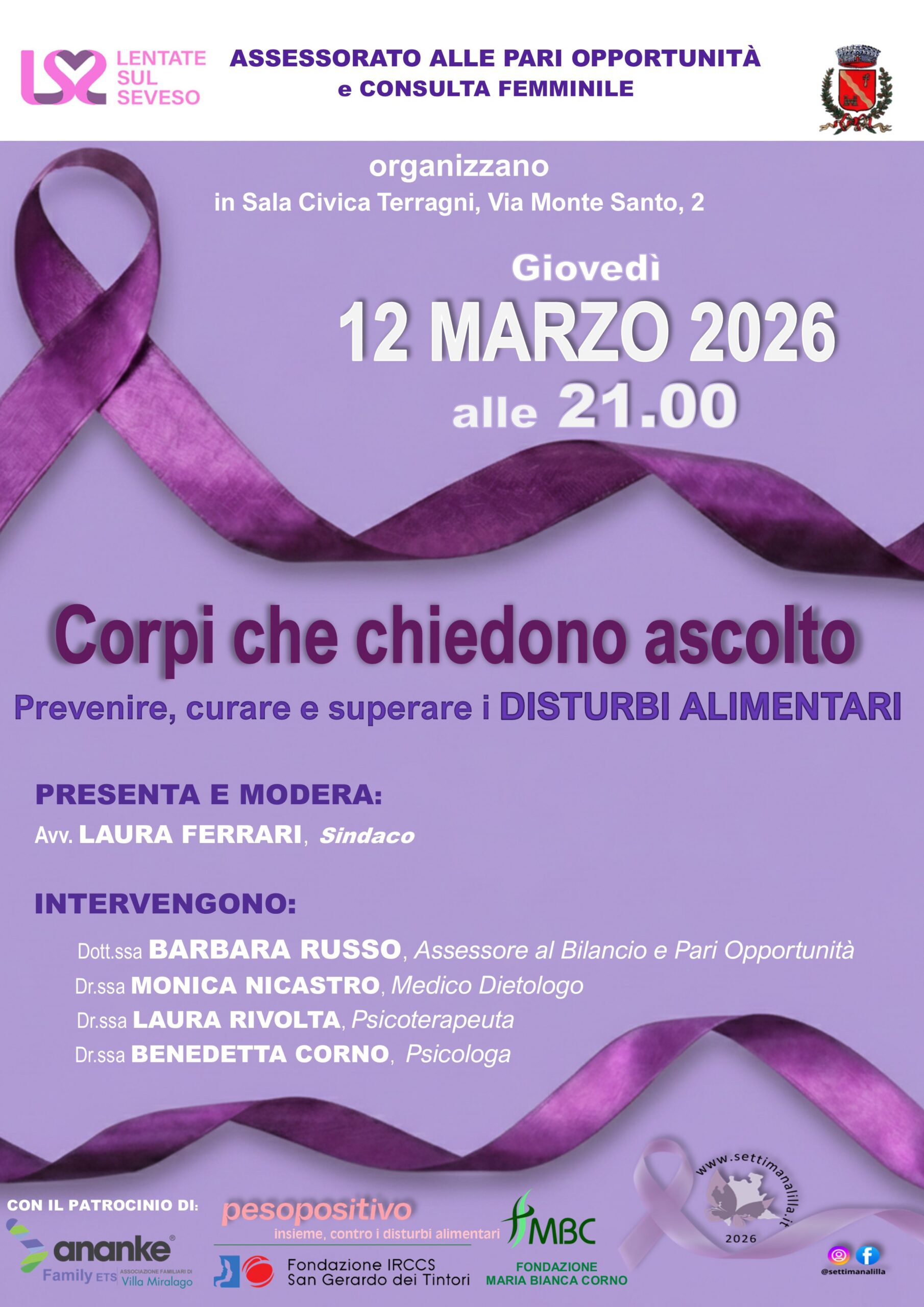 L’assessorato alle pari opportunità e Consulta femminile organizzano l’evento della serata dedicata ai Disturbi alimentari.